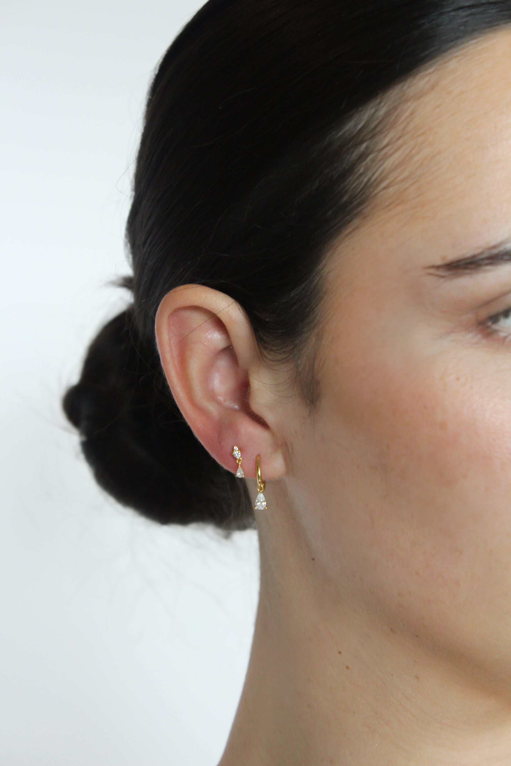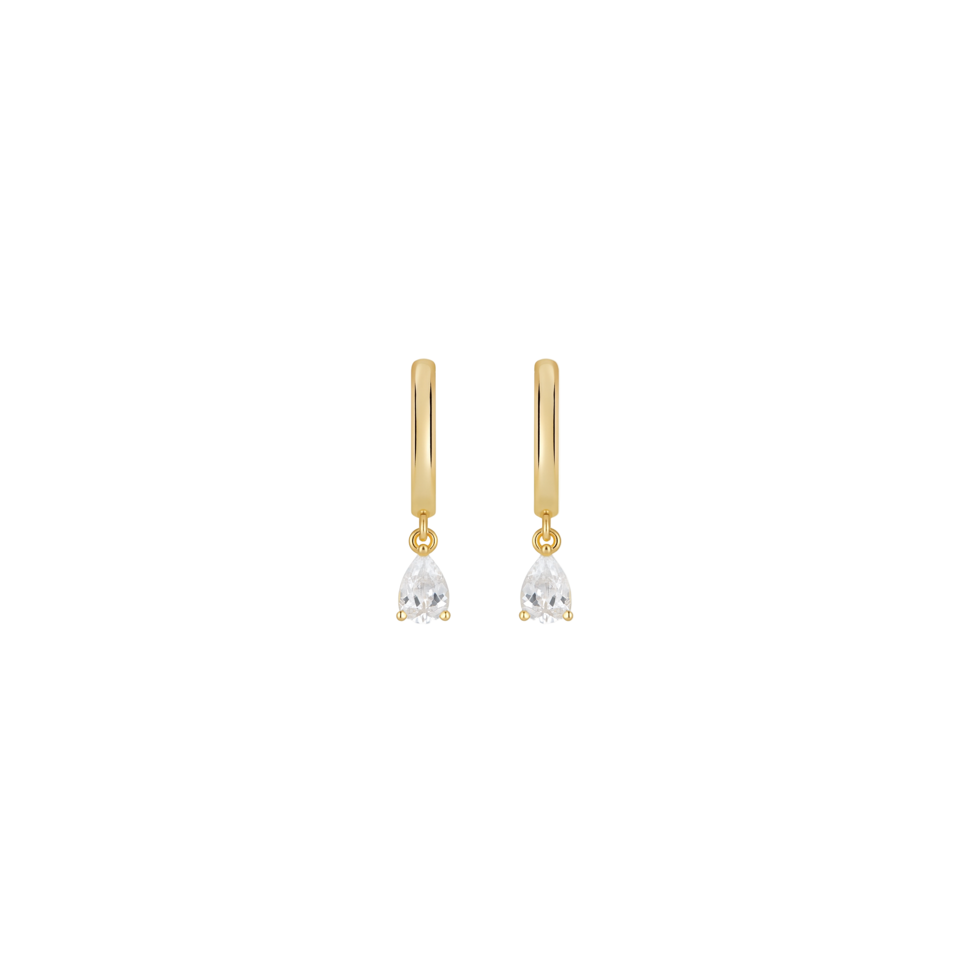 Our Maia Hoops feature a pear-drop silhouette, crafted from 18k gold-plating on S925 sterling silver with a sparkling cubic zirconia drop. Hypoallergenic and tarnish-resistant, they’re lightweight with a secure hinge closure, perfect for everyday wear and stacking.