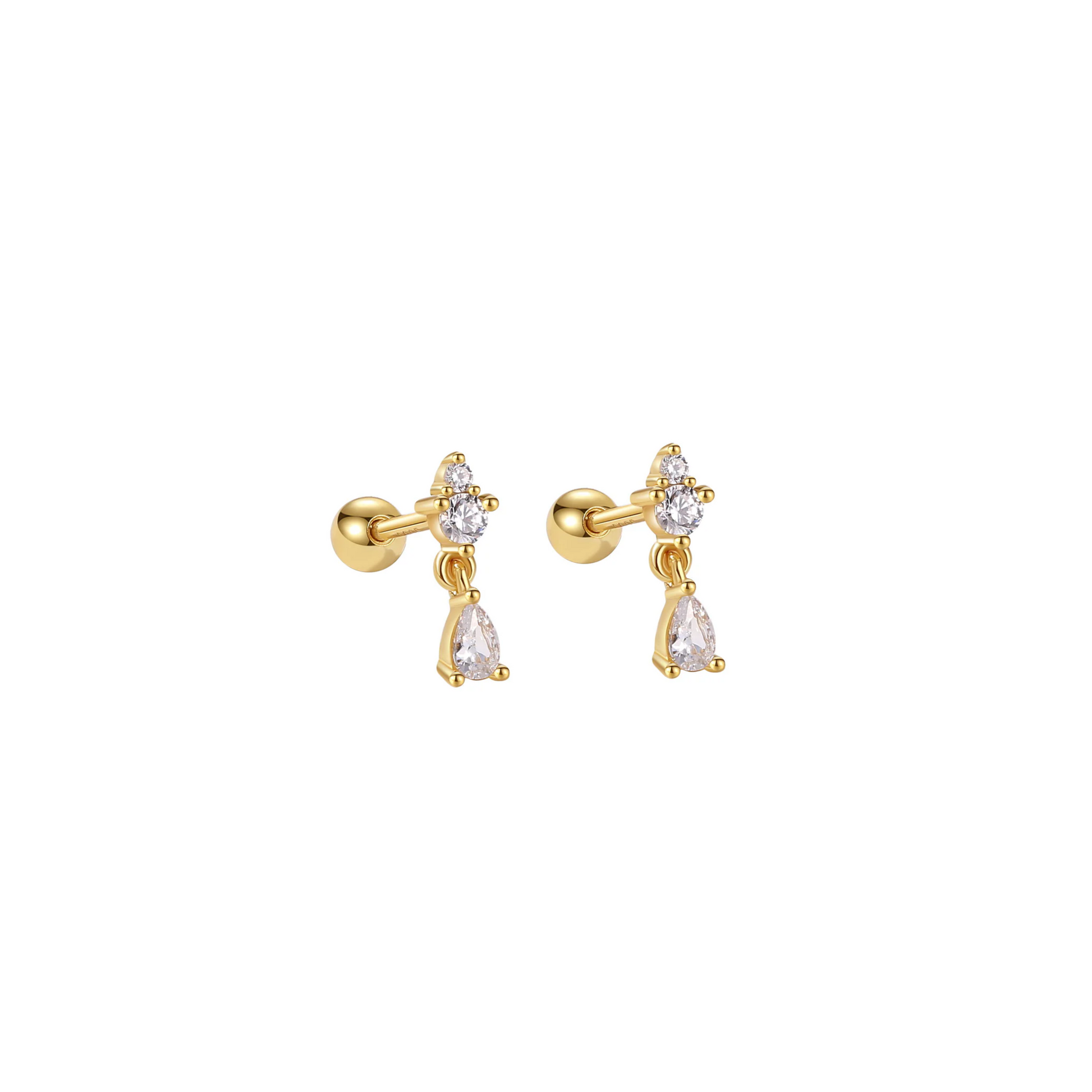 The Noa Studs feature a trio of stones with a teardrop-shaped drop. Crafted from 18K gold-plating on S925 sterling silver, they offer lightweight elegance with lasting durability. Perfect for second piercings, stacked, or as a minimal statement on their own. They’re tarnish-resistant, hypoallergenic, and gentle on sensitive ears.
